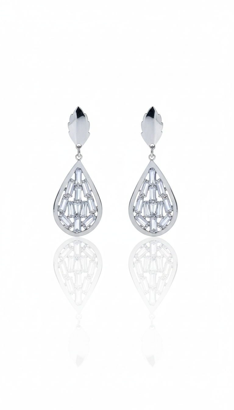 Kristal baget taşların titizlikle yerleştirildiği su Damla formu yüzünüze ve kombinlerinize zenginlik katacak..