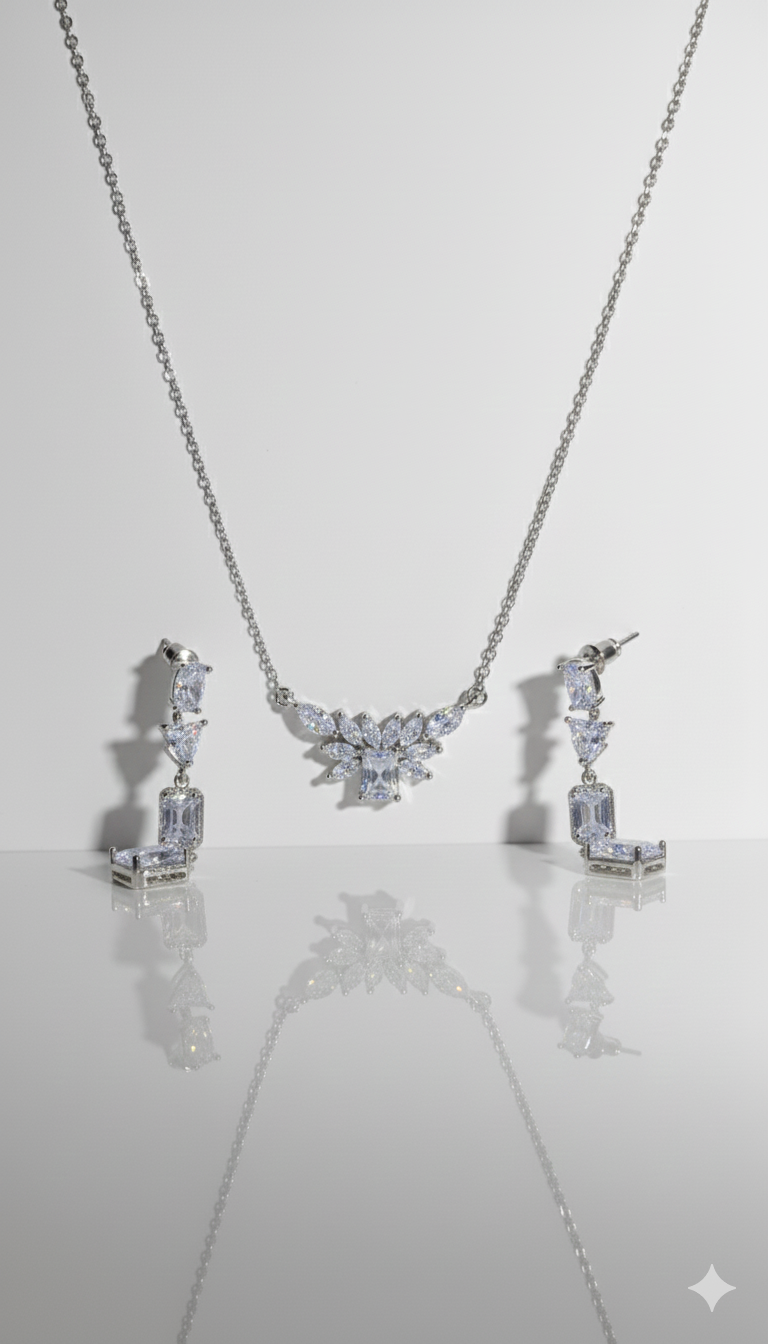 Baget ve Markiz kesim taşlı kolye ve küpe seti özel günlerinizin vazgeçilmezi olacak.